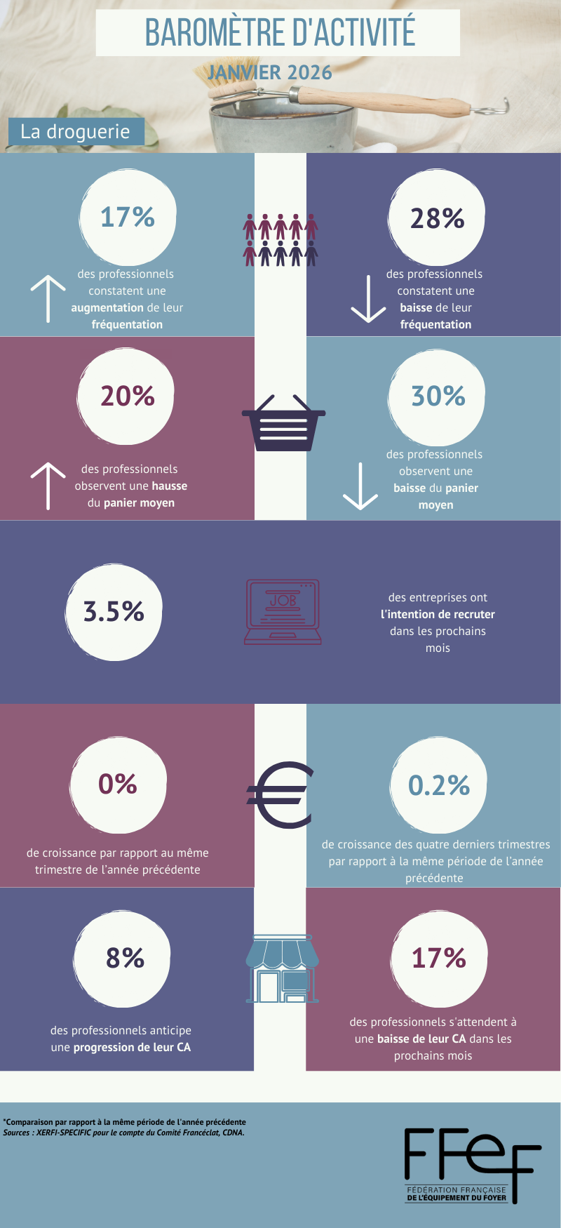 L’activité des commerces de drogueries demeure stagnante en 2025, le secteur affiche une croissance quasi nulle de 0.2%. Après une légère progression observée au premier trimestre (+0.5%), le chiffre d’affaires reste nul aux deuxième, troisième et quatrième trimestres 2025. Au quatrième trimestre, cette stabilité masque toutefois une dégradation des fondamentaux, avec une baisse de la fréquentation pour 28% des professionnels et un recul du panier moyen pour 30% d’entre eux.